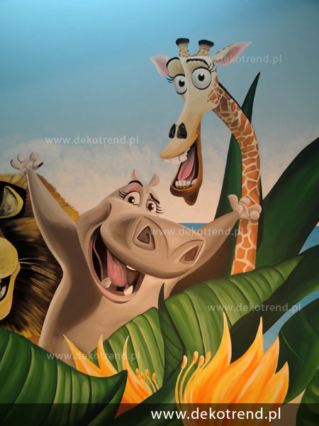 Malowidła przedstawiające kreskówkę Madagaskar, to częsty motyw w salach zabaw, przedszkolach oraz w pokojach dziecięcych. To bardzo dynamiczna, energetyczna i wesoła bajka. Mimo, że postacie są w stonowanej kolorystyce brązów i szarości, to mają tyle energii w sobie i są tak zabawne, że nie trzeba niczego więcej. Postacie z Madagaskaru są w większości futerkowe, a jest to bardzo efektowne, gdy ogląda się je z bliska. Potrafimy bezbłędnie odwzorować futro tego typu postaci, jak Alex, Marty, Król Julian, Mort. Kontrastujące tło z plażą i morzem dopełnia całość.