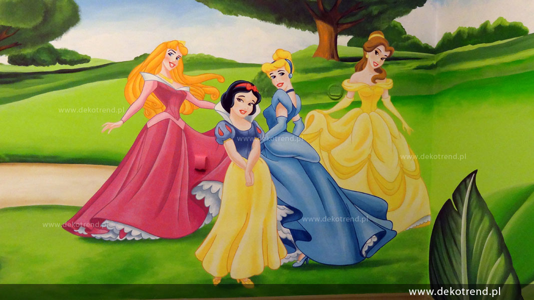 Oto pokój małej księżniczki, który imituje komnatę zamkową. Wymarzony pokój dla każdej małej dziewczynki. Róż ścian został wzbogacony złotymi motywami (pasy, korona, ramy), które pięknie odbijają światło i wyglądają, jak prawdziwe złoto. Malowidło to łączy w sobie wszelkie motywy dziewczęce: pałac, Kopciuszek, wróżki, ptaszki, motylki, kwiatki, baldachim, jednorożec, korona, falbany, no i oczywiście kolor różowy. Głównym motywem są Wróżki Disney'a.