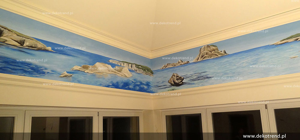 Pas ograniczony sztukaterią, który okala całe pomieszczenie, zostało ozdobione pejzażami morskimi przedstawiającymi wyspy greckie.
