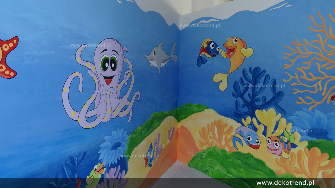 Ta salka urodzinowa sali zabaw została ozdobiona motywem morskim. Przedstawia różne zwierzęta morskie pod powierzchnią wody. Tutaj został połączony efekt cieniowanego tła z lekko przestrzennie malowaną roślinnością morską a płasko malowanymi rybkami. Czarny kontur postaci oddziela i wyróżnia je z niebieskiego tła. Malowidło to prezentuje jeden ze sposobów zakończenia malowidła, aby nie trzeba było malować ściany do samego sufitu. Fale morskie u góry płynnie kończą malowidło.