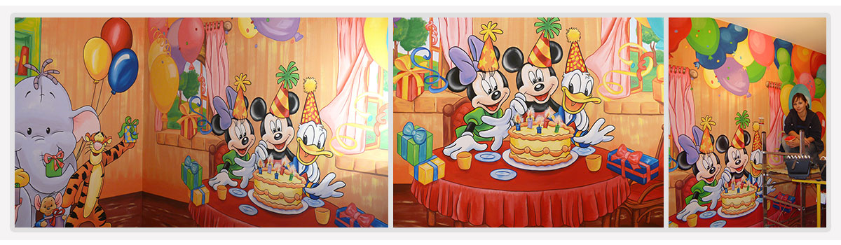 Malowidło zdobi salę urodzinową sali zabaw i jest bogato zdobione elementami urodzinowymi: balony, tort, świeczki, prezenty, czapeczki, konfetti. Każda ściana przedstawia bohaterów innych bajek. Na jednej Myszka Micky i Minnie oraz Kaczor Donald z tortem śpiewają sto lat. Na drugiej Kubuś Puchatek i przyjaciele przychodzą z prezentami. Na trzeciej kot Sylwester z Looney Tunes trzyma balony. Całe pomieszczenie zostało zaprojektowane w ten sposób, aby tworzyło wnętrze pomieszczenia. Są tam okna, drzwi, meble, dywan. Całość utrzymana jest w ciepłej, pomarańczowej kolorystyce.
