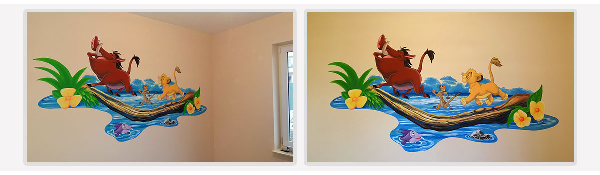W poniższym pokoju zostały namalowane postacie z bajki Król lew: Simba, Pumba i Timon. Można zobaczyć, że nie trzeba malować całej ściany, a nie rezygnować z tła poza postaciami. Dzięki temu, że na dole obrazka jest woda, można było ograniczyć powierzchnię, zamykając kompozycję falującą formą. Natomiast u góry malowidła po prostu zrezygnowano z nieba, kończąc tło na lesie w oddali.