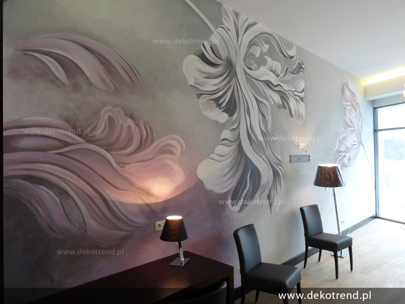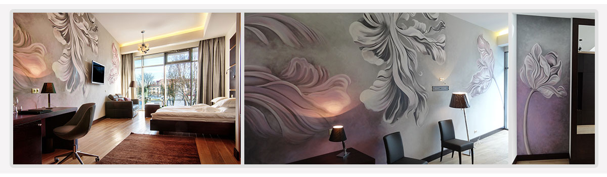 Artystyczne malowidło może zdobić dowolne pomieszczenie przestrzeni prywatnej, jak i publicznej. Wystarczy ciekawy pomysł, który zwizualizujemy. W tym przypadku malowidło zdobi główną ścianę hotelowej restauracji. Na białym tle namalowany został czarny linearny rysunek kwiatowy. Stylem rysunku, jak i wykorzystaniem złota, dekoracja nawiązuje do secesji. Złote kwiaty zostały wyklejone specjalnymi płatkami złota, wykorzystywanymi przez konserwatorów zabytków. Nawiązują one do złotych elementów wystroju pomieszczenia, tj. żyrandole i zasłony. Wnętrze robi wrażenie bogatego i ekskluzywnego.