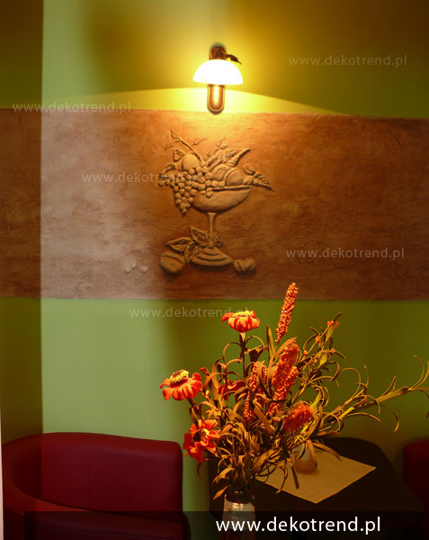 Podłużny prostokąt wypełnia tynk dekoracyjny o nieregularnej strukturze z trzema płaskorzeźbami podświetlonymi przez kinkiety. Płaskorzeźba ta dekoruje korytarz restauracji. Tynk został wycieniowany brązową bejcą, która jest ciemniejsza w zagłębieniach, a jaśniejsza na wypukłościach. Na środku płaskorzeźbę zdobi kompozycja przedstawiająca misę na wysokiej nóżce z owocami, które wysypują się poza nią. Po bokach, w lustrzanym odbiciu, została przedstawiona martwa natura z kwiatem, dzbanem i owocami.